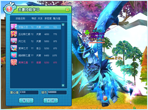 夫妻阵法技能――维纳斯之星;可找假日牧场的爱情使者(215,159)学习。