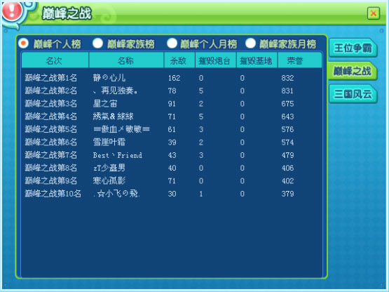 巅峰个人榜:根据当次活动的个人荣誉来进行排行,进入前十名分别获得巅峰之战第1名、第2名以此类推(该称谓持续到下次活动才重新统计)